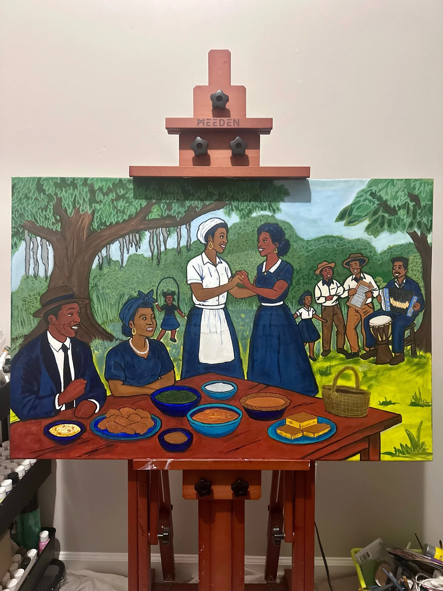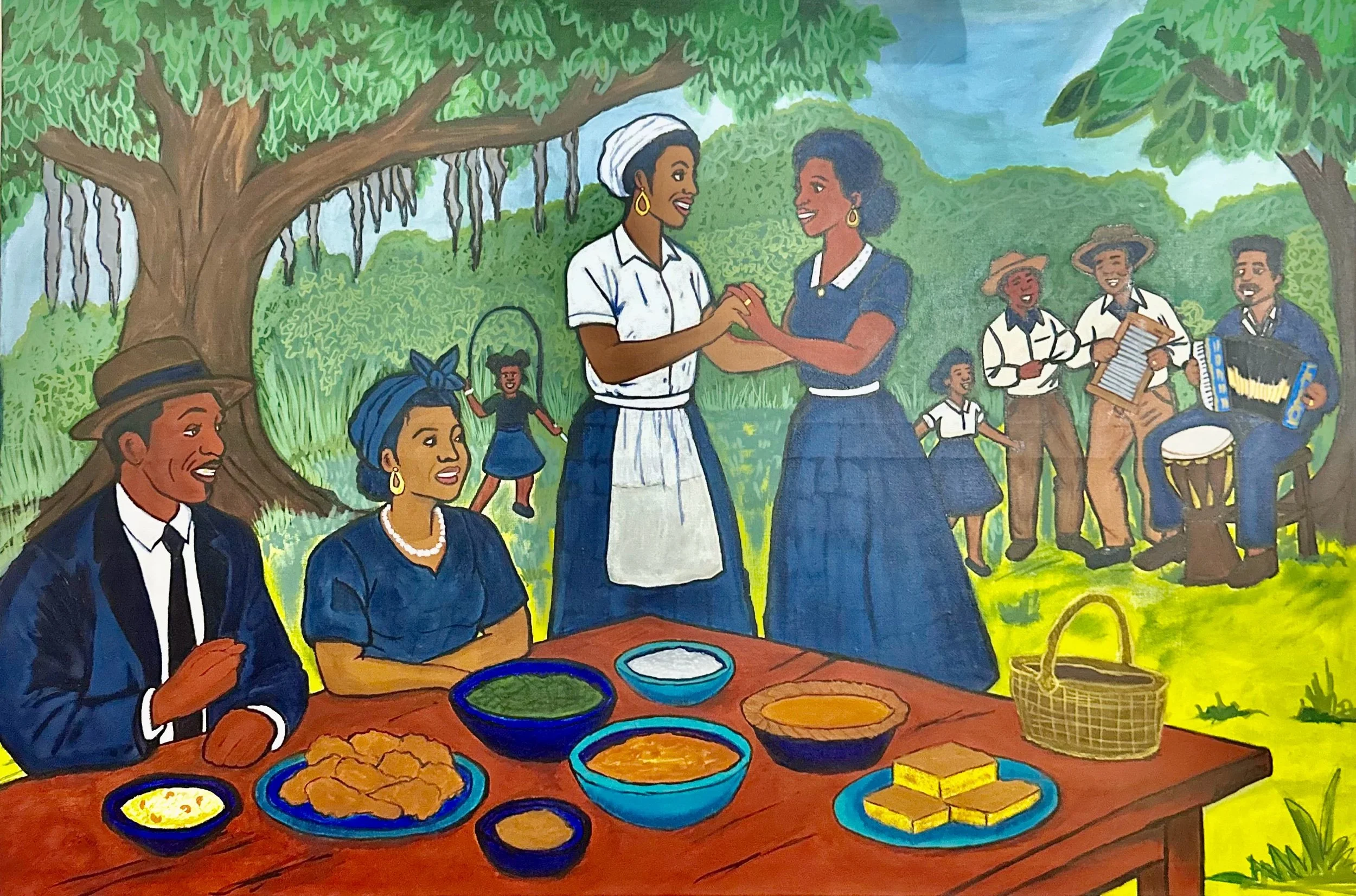 A vibrant Southern gathering beneath mossy trees where music, food, and dance celebrate Gullah Geechee heritage, family bonds, and the joy of shared tradition.
